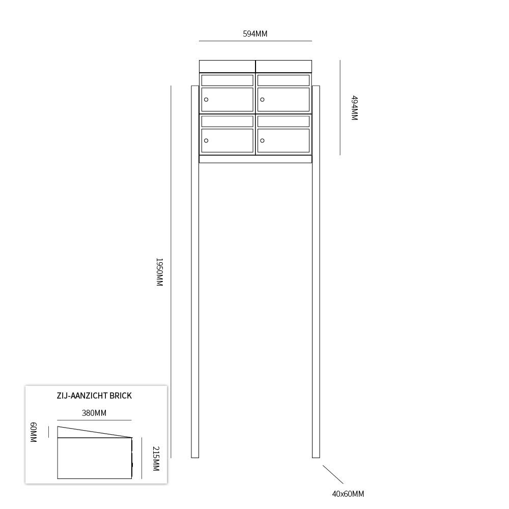 De Stoer! Brick 2-breed, 2-hoog met dak op statief zwart is een modulair brievenbussysteem die uit voorraad geleverd kan worden. Deze set bestaat uit 4 brievenbussen, 2 dakjes en een statief, en wordt als compleet blok geleverd.