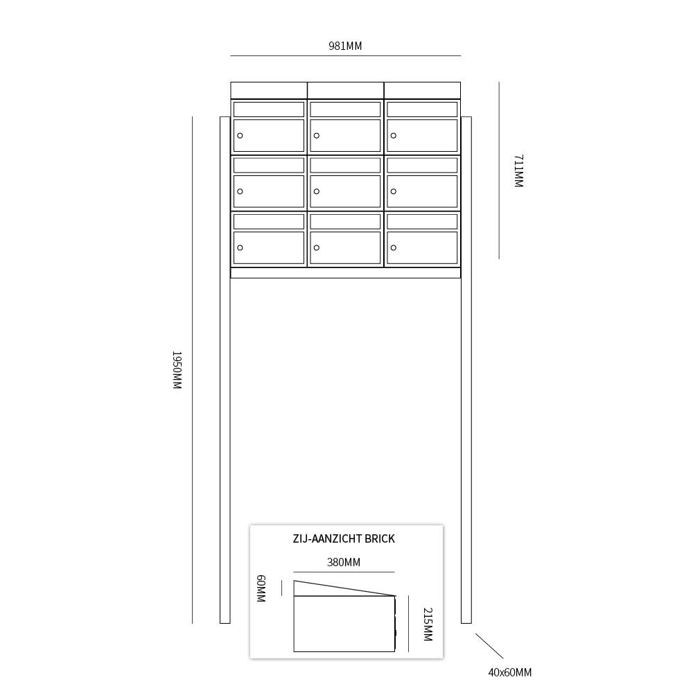 Per brievenbus is de Brick met zijn compacte maat van 295x215x380 (bxhxd) een perfect in te zetten brievenbus voor aan de wand, in de wand en op statief.