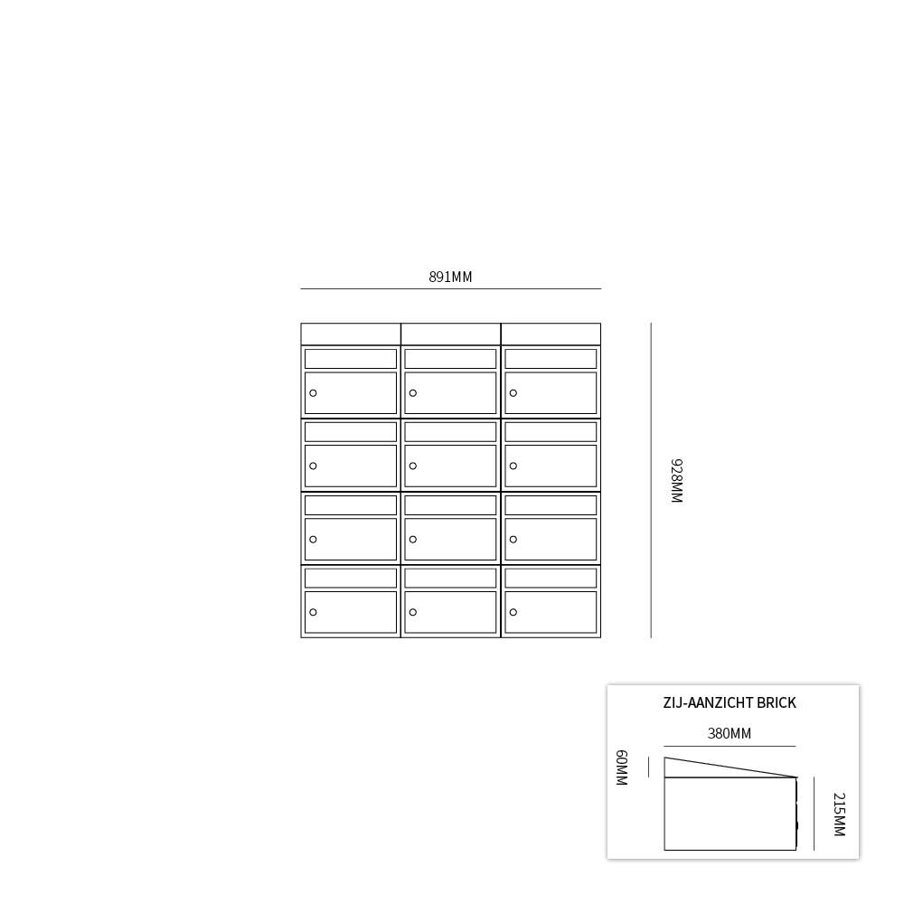 De Stoer! Brick 3-breed, 4-hoog met dak antraciet is een modulair brievenbussysteem die uit voorraad geleverd kan worden. Deze set bestaat uit 12 brievenbussen en 3 dakjes, en wordt als compleet blok geleverd.