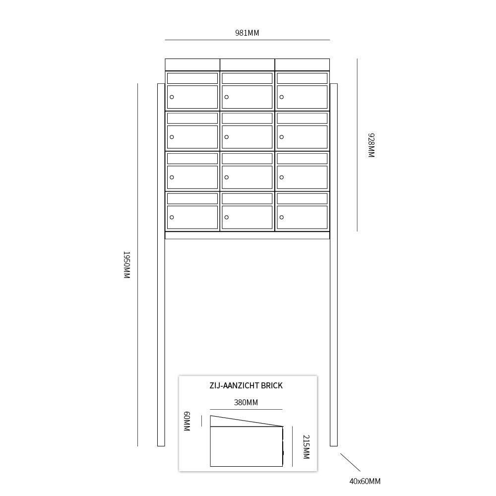 Per brievenbus is de Brick met zijn compacte maat van 295x215x380 (bxhxd) een perfect in te zetten brievenbus voor aan de wand, in de wand en op statief.