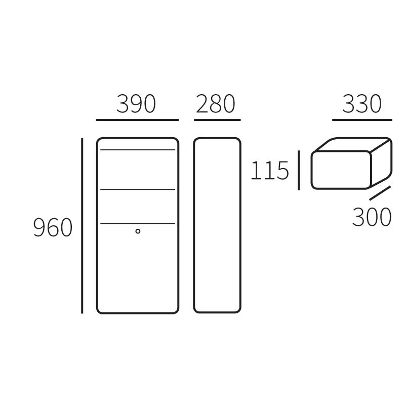 Afmetingen pakket brievenbus (hxbxd): 960x380x280 mm. Inwerpopening / max. pakketgrootte (hxbxd): 115x330x300 mm.